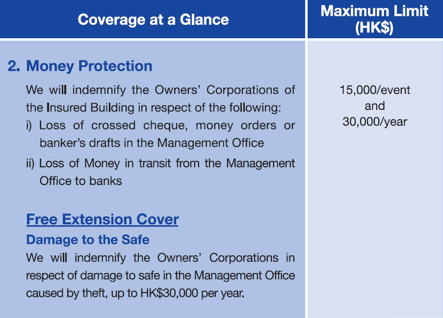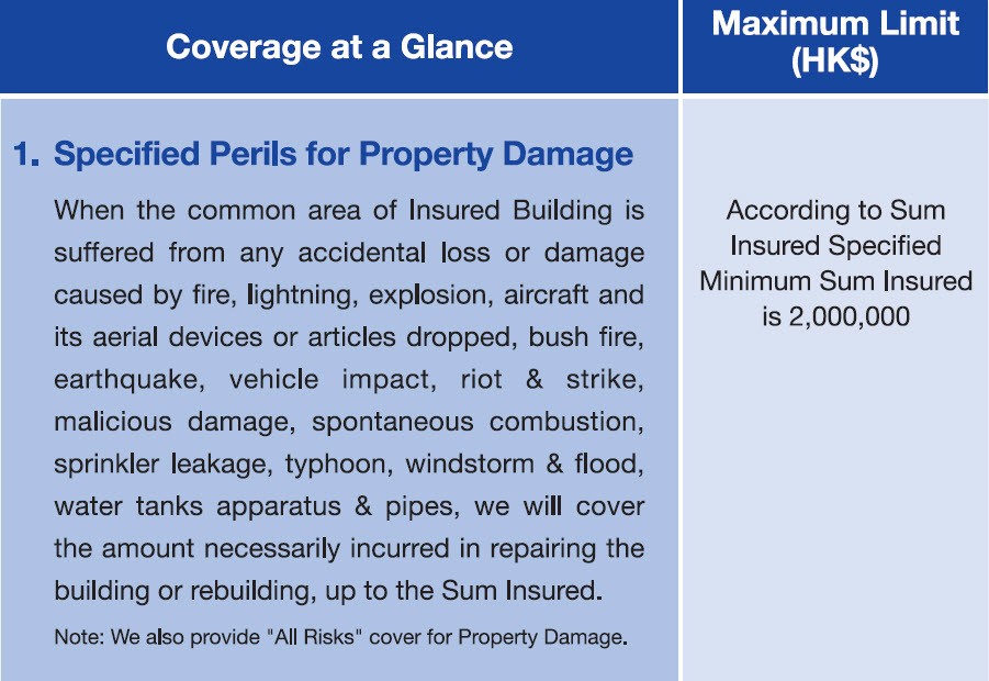 - Excess of HK$5,000 is required for each and every loss under Sections of Property Damage and Public Liability respectively; in respect of water damage, the excess of these two sections is HK$10,000, or 10% of adjusted loss, whichever is greater.