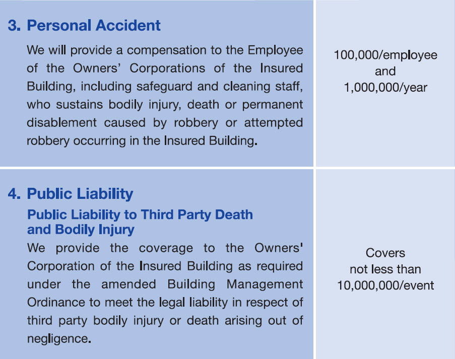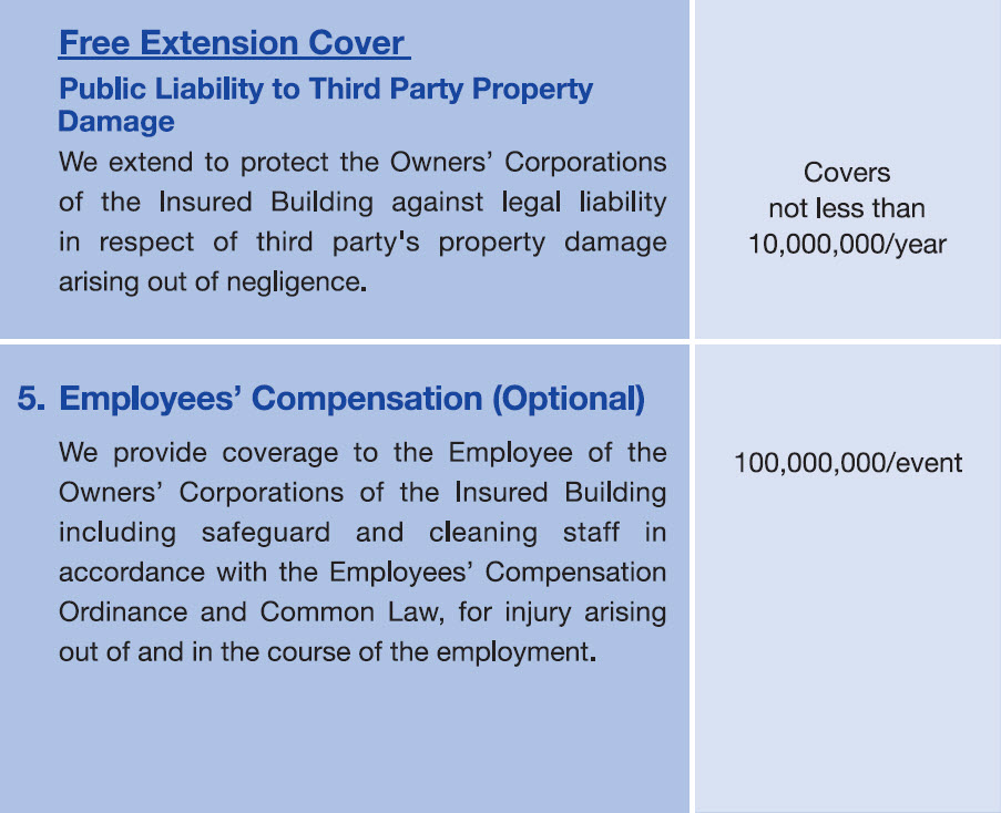 The Government has amended the Building Management Ordinance to require all Owners' Corporations of residential buildings to effect compulsory third party liability insurance on or after 1 January 2011. In this regard, Prudential offers a comprehensive insurance - PRUchoice Building Management Xtra, building management insurance plan for private residential buildings. It not only provides the third party liability insurance as required by the amended ordinance, but also offers Owners' Corporations suitable insurance protection for the common area of the building including facilities therein, the money under its management and an optional coverage to insure Employee's Compensation for their employees.