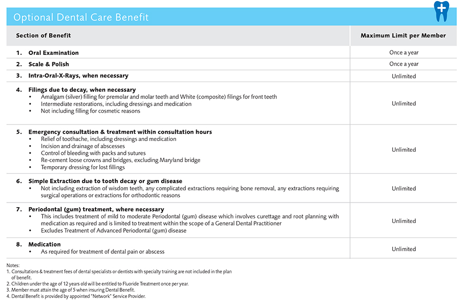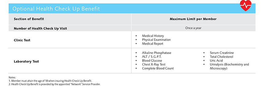- Member must attain the age of 5 when insuring “Optional Dental Care Benefit” and age of 18 when insuring “Optional Health Check Up Benefit”.
